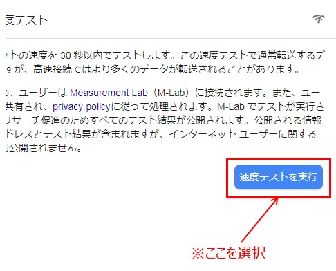 測定ページへ進むと、画面最上部にGoogleが提供する速度テストが表示されますので右側にある『速度テストを実行』を選択してください。